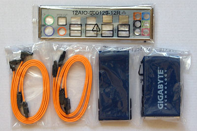 Список прилагающихся к плате аксессуаров очень скромен. В единый "патронташ" упакованы шлейфы для FDD и IDE, два Serial ATA кабеля с прямыми и два с Г-образными коннекторами. Не забыта и заглушка для задней панели (I/O Shield) с кодированными цветом разъёмами.