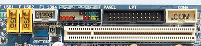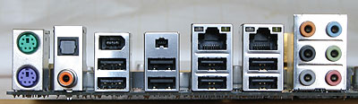Как видите, при необходимости к материнской плате Gigabyte GA-EP45-DS3 можно подключить устройства, использующие интерфейсы COM и LPT, хотя на заднюю панель они не выведены. Там имеются PS/2 разъёмы для клавиатуры и мышки, коаксиальный и оптический S/PDIF, шесть аудио-коннекторов (для восьмиканального звука использован кодек Realtek ALC889A), два порта IEEE1394, восемь портов USB2.0 и два сетевых RJ45, работу которых обеспечивают два гигабитных сетевых контроллера Realtek RTL8111C.