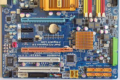 Материнская плата Gigabyte GA-EP45-DS3 относится к серии Ultra Durable 2, то есть в шестифазной схеме питания процессора используются высококачественные и эффективные компоненты, и на самой плате можно найти только конденсаторы с твёрдым электролитом. Разъёмы питания – 24-х контактный ATX и 8-и контактный ATX12V, равно как и коннектор FDD, расположены довольно удобно. Места для установки крупногабаритных систем охлаждения процессора вполне достаточно. Больше о верхней части платы сказать нечего, разве что в правом верхнем углу расположена линейка разноцветных светодиодов, которые сообщают о количестве задействованных в данный момент фаз в схеме питания процессора.