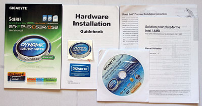 Кроме того, к плате прилагается немалое количество справочной литературы: руководство к плате; выполненные в виде книжечки, а не плаката краткие инструкции по инсталляции на нескольких языках; руководство по установке боксового кулера для процессоров Intel. В комплект входит не CD, а DVD с программами и драйверами, наклейки на системный блок с логотипами Gigabyte и технологии энергосбережения Dynamic Energy Saver.