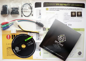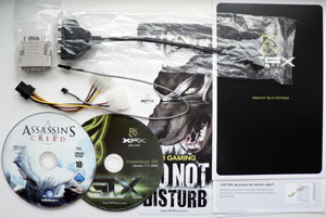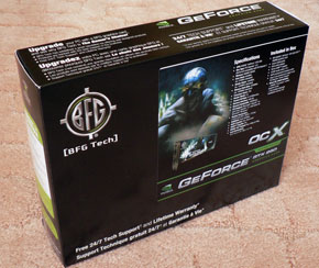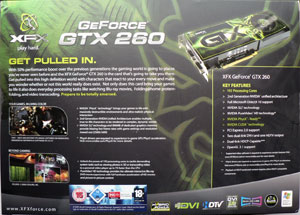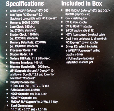 На лицевой стороне упаковки от XFX помимо модели видеокарты указаны объём и тип видеопамяти, версия и тип интерфейса, частота графического процессора, а также приклеен ярлычок с информацией о нахождении внутри коробки DVD-диска с игрой Assassin's Creed. А вот у BFG, помимо всего прочего, на лицевой стороне коробки приведены подробнейшие спецификации видеокарты (по которым можно узнать, что GeForce GTX 260 далеко не стандартная) и перечень комплектации: