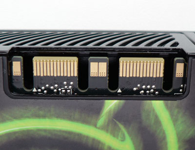 Два разъёма MIO для построения SLI и 3-Way SLI систем из двух или трёх одинаковых видеокарт, закрыты резиновым колпачком, который легко снимается: