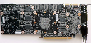 Так как объём видеопамяти у GeForce GTX 260 меньше чем у GeForce GTX 280, то на лицевой и на оборотной сторонах PCB можно обнаружить по одной нераспаянной контактной площадке под микросхемы памяти.