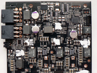 На противоположном конце верхней части плат установлены разъём для подключения звукового S/PDIF кабеля, а также два шестиконтактных разъёма для подключения дополнительного питания: