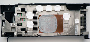 Тем не менее, судя по результатам тестирования, когда температура GPU в пике нагрузки не превышала 60 градусов Цельсия, а PCB прогревалась не выше 45 градусов, можно сделать вывод, что даже две шпильки по диагонали обеспечили достаточный прижим основания кулера к теплораспределителю графического процессора. В то же время, владельцам альтернативных систем охлаждения для GeForce 8800, необходимо учитывать, что, скорее всего, их кулеры не подойдут для установки на GeForce GTX 260 и GTX 280, либо потребуют ручной доработки.