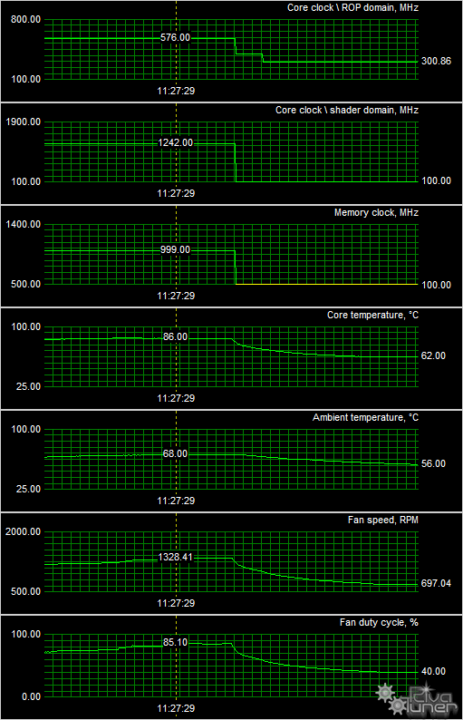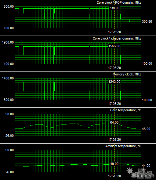При этом необходимо отметить, что комнатная температура была довольно высокой (около 26~26.5 градусов Цельсия), отсюда и сравнительно высокая температура видеокарты. Также обращаю ваше внимание, что турбина системы охлаждения функционировала в автоматическом режиме и раскрутилась во время теста до ~1330 об/мин, что уже довольно шумно (субъективная граница комфорта равна 900~950 об/мин).