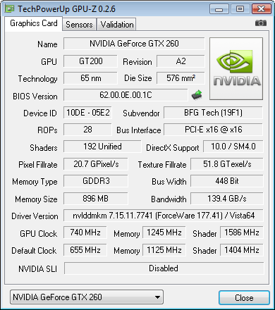 В сравнении с GPU GeForce GTX 280, у чипа GTX 260 число унифицированных шейдерных процессоров урезано с 240 до 192 (-20 %) штук, текстурных блоков сокращено с 80 до 64 (-20 %), а число блоков растеризации уменьшено с 32 до 28 штук (-12.5 %). В дополнение к этому, частота графического процессора понижена с 602/1296 МГц до 575/1242 МГц. Однако, рассматриваемые сегодня видеокарты обладают частотами GPU выше не только референсной частоты GeForce GTX 260, но и GeForce GTX 280! Так, продукт от XFX с дополнением к наименованию видеокарты трёх иксов "XXX" имеет заводской разгон графического чипа до частот в 640/1363 МГц, а видеокарта от BFG "OCX" по GPU разогнана ещё больше, – её частотная схема равна 655/1404 МГц! Таким образом, оба производителя предлагают потенциальным покупателям гарантированно разогнанные и стабильные видеокарты, что не может не радовать тех, кому оверклокинг чужд. Но и для оверклокеров здесь также имеется практическая польза, – как правило, для таких видеокарт графические процессоры проходят специальный отбор, что и позволяет им работать на более высоких частотах без потери в стабильности и снижения качества картинки.