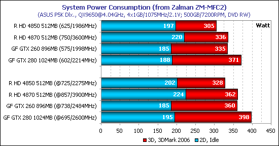 Измерение энергопотребления видеокарт осуществлялось с помощью многофункциональной панели Zalman ZM-MFC2. Данная панель измеряет потребление системы в целом (без учёта монитора), а не отдельного компонента системного блока (подробная конфигурация указана в следующем разделе). Измерение было проведено в 2D-режиме, при обычной работе в Word или Internet-серфинге, а также в 3D-режиме, нагрузка в котором создавалась с помощью пятикратного бенчмарка Firefly Forest из синтетического графического бенчмарка 3DMark 2006 в разрешении 1920 х 1200 с активированным полноэкранным сглаживанием степени 4х и анизотропной фильтрацией уровня 16х. Столь ресурсоемкий для видеокарт графический режим выбран в целях минимизации влияния на результаты измерений прочих компонентов системного блока (в первую очередь, конечно же, центрального процессора).