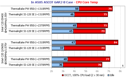 С разгоном двухъядерного процессора система жидкостного охлаждения справляется вполне сносно, хотя и проигрывает одному из лучших суперкулеров современности в обоих режимах работы одинакового вентилятора. А вот четырёхъядерный процессор оказался Thermaltake PW 850i ProWater уже "не по зубам", так как и проигрыш воздушному кулеру здесь более чем существенный, да и максимальная частота разгона процессора при использовании СВО оказалась не достигнута. Разница в тихом режиме работы вентилятора составила аж 11 градусов в пользу Thermalright SI-128 SE, а на максимальной скорости вращения крыльчатки разрыв сокращается до 7 градусов, что в первую очередь говорит о слабом радиаторе в системе жидкостного охлаждения, недостаточном для обеспечения эффективного рассеивания теплового потока.