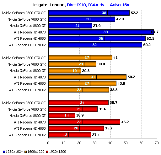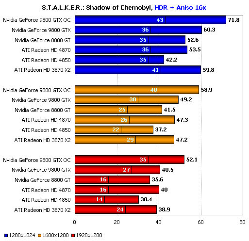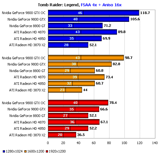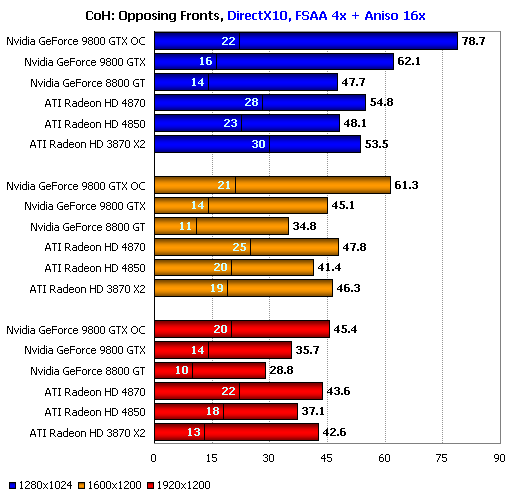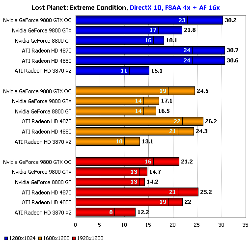 Ещё один случай впечатляющей, но бессмысленной победы, когда ценой лишения карты повседневной функциональности удаётся добиться рекордной цифры. При чуть менее низком уровне минимальной производительности обычный серийный ATI Radeon HD 4870 способен обеспечить игроку столь же комфортные условия в игре. ATI Radeon HD 4850 также смотрится вполне неплохо даже в разрешении 1920х1200, ведь шутеры с видом от третьего лица предъявляют более скромные требования к среднему и минимальному fps, нежели их собратья с видом от первого лица.