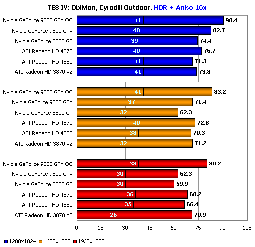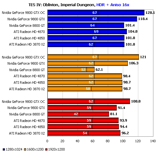 Борьба с новым поколением ATI Radeon HD практически бесполезна, и только в разрешении 1920х1200 экстремальный разгон позволил Nvidia GeForce 9800 GTX на 8%-9% опередить ATI Radeon HD 4850. Впрочем, именно в этом разрешении он как раз и позволил добиться приемлемой производительности, но, к сожалению, использовать карту в таком режиме сколько-нибудь длительное время нельзя, а Nvidia GeForce 9800 GTX+ имеет более скромный разгон и, скорее всего, не сможет достичь такого же уровня скорости.