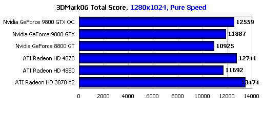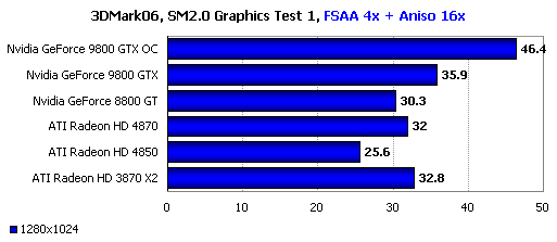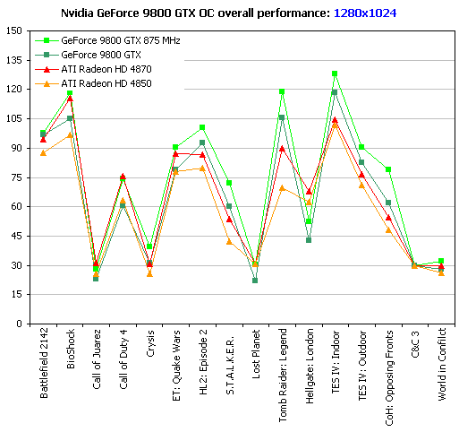 В разрешении 1280х1024 в ряде случаев графический адаптер не является главным компонентом, ограничивающим производительность, поэтому, прирост, полученный от повышения тактовых частот ядра Nvidia GeForce 9800 GTX до 875/2188 МГц, выглядит на сводной диаграмме не слишком серьёзным. Существенного преимущества над ATI Radeon HD 4870 удалось достичь менее чем в половине тестов, а точнее, в 7 позициях из 16, если считать результаты TES IV: Oblivion за 2 отдельных позиции. При этом, в 6 случаях из этих 7 практической пользы не удалось бы извлечь, даже если бы карта могла работать на таких частотах длительное время без последствий; лишь в Crysis прирост был заметен невооружённым глазом. Очевидно, что серийный Nvidia GeForce 9800 GTX+ не дал бы и такого прироста скорости, а значит, не стал бы серьёзным противником для ATI Radeon HD 4870, да и перед ATI Radeon HD 4850 его преимущество было бы весьма спорным.