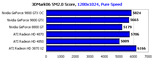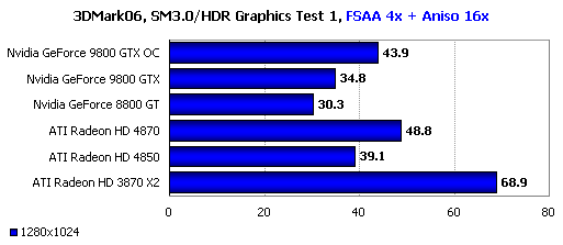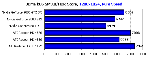 Хотя во втором тесте SM3.0/HDR «подопытному кролику» и удаётся опередить ATI Radeon HD 4870 на 16%, в первом тесте все попытки оказываются бесплодными и последний продолжает устойчиво удерживать второе место после двухчипового ATI Radeon HD 3870 X2. Не стоит забывать, что речь идёт о серийной карте с серийными частотами, работающей в номинальном режиме с низком уровнем шума и без риска преждевременной смерти от переразгона с повышением напряжения питания ядра.