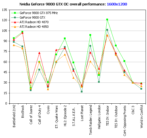 Переход к разрешению 1600х1200 лишь укрепляет положение новых графических карт ATI, и на фоне ATI Radeon HD 4870 разогнанный Nvidia GeForce 9800 GTX смотрится ещё более скромно, нежели в предыдущем случае. Из шести побед значимой с точки зрения игрока можно признать лишь победу в S.T.A.L.K.E.R. Даже приобретение младшей модели нового семейства ATI Radeon HD выглядит более оправданным шагом, нежели попытки разгона Nvidia GeForce 9800 GTX – без применения аппаратных модификаций серьёзного преимущества в высоких разрешениях получить не удастся, а с модификациями велик риск уничтожить саму карту.