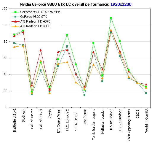 Давайте посмотрим сводные диаграммы производительности, чтобы более точно разобраться, что даёт экстремальный разгон GeForce 9800 GTX.