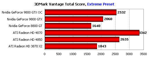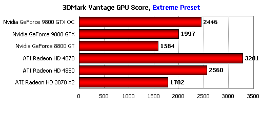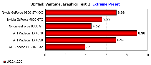 В 3DMark Vantage фокус с прямым наращиванием тактовых частот помогает плохо, и в результате, разогнанный с применением аппаратной модификации системы питания Nvidia GeForce 9800 GTX лишь подтверждает, что время архитектуры GeForce 8/9 прошло, и она уже может считаться архитектурой предыдущего поколения. Единственное, чего удаётся достигнуть – это сократить до минимума отставание от ATI Radeon HD 4850; о конкуренции с ATI Radeon HD 4870 не может быть и речи.