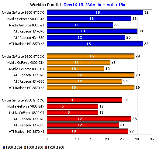 В отличие от Company of Heroes, в World in Conflict именно разогнанный Nvidia GeForce 9800 GTX ближе всего подошёл к комфортному уровню производительности в технодемке, показав существенно более высокий минимальный fps, чем даже ATI Radeon HD 4870. Увы, общий прирост производительности оказался не очень большим, а у серийных Nvidia GeForce 9800 GTX+ он будет ещё меньше.