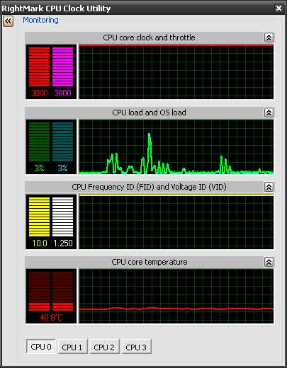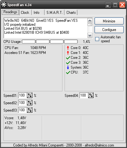 Все тесты были выполнены в операционной системе Windows XP Professional Edition SP3. Для осуществления мониторинга температуры процессора и материнской платы, а также скорости вращения вентиляторов кулеров использовалась утилита SpeedFan версии 4.34, считывающая температуру непосредственно из регистров процессора: