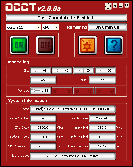 Разогрев CPU был выполнен с помощью программы OCCT (OverClock Checking Tool) версии 2.0.0а в режиме максимальной нагрузки на процессор при 23-минутном периоде тестирования, из которого одна первая и четыре последние минуты являются временем простоя системы:
