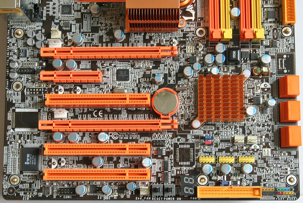 Материнская плата DFI LANPARTY DK X48-T2RS, благодаря удачному цветовому сочетанию тёмного текстолита и жёлто-оранжевых разъёмов, выглядит очень нарядно.