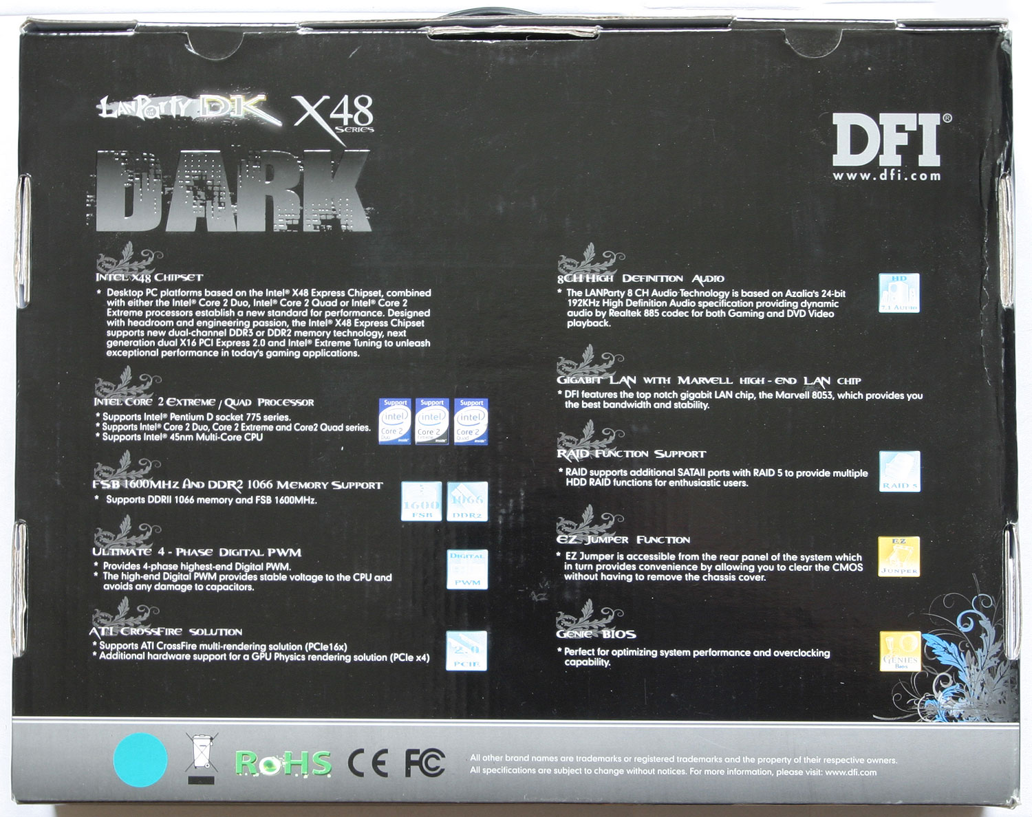 Системная плата DFI LANPARTY DK X48-T2RS поставляется в коробке ожидаемого чёрного цвета. Для оформления использовано минимальное количество декоративных элементов – это традиционно для плат DFI.