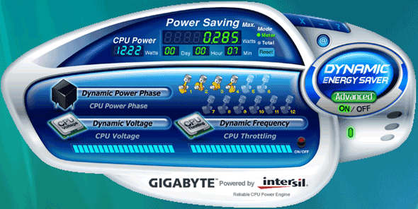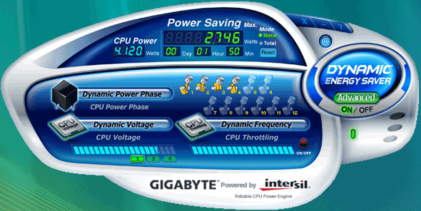 За реализацию комплекса энергосберегающих технологий DES (Dynamic Energy Saver) на платах Gigabyte отвечает одноимённая утилита. С её функциональностью мы тоже уже знакомы по обзору материнской платы Gigabyte GA-X48T-DQ6, однако теперь используется новая ревизия, которая называется Gigabyte Dynamic Energy Saver Advanced. Свежая версия программы B8.0905.1 была скачана с сайта Gigabyte.