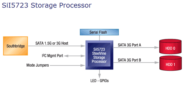 Для чего вообще понадобилось применять эти Silicon Image Sil5723, почему бы не установить вместо них парочку "полноценных" SATA RAID контроллеров? Есть несколько причин. Прежде всего, каждый дополнительный контроллер забирает себе одну линию PCI Express, но их и так постоянно не хватает на все нужды, а тут мы "бесплатно" удваиваем количество портов. Кстати, вопрос цены тоже может играть свою роль. Кроме того, пользоваться подключенными к Silicon Image Sil5723 дисками очень просто, поскольку не требуется установка драйверов. К тому же эти контроллеры обладают очень интересными возможностями, например, можно строить целые каскады дисков.