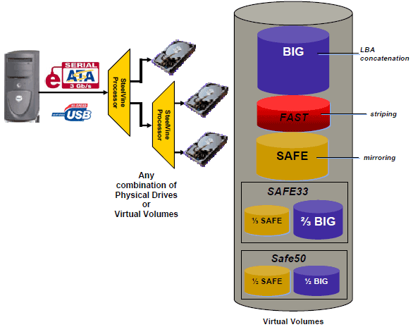 Жёсткие диски, которые подключены к Silicon Image Sil5723, могут работать в режиме BIG, то есть представляться системе одним большим HDD. Могут работать в режиме FAST – это аналог RAID0, когда информация, чередуясь, записывается или считывается одновременно с двух HDD, за счёт чего мы получаем существенный прирост в скорости. Однако выход одного диска из строя влечёт за собой потерю всей информации на обоих и в этом случае поможет режим SAFE. Это аналог RAID1, зеркалирование, то есть данные дублируются на два диска и, в случае проблем с одним HDD, информацию можно считать с другого. Скорость такая же, как при использовании одного диска, надёжность высокая, но теряется ровно половина доступного объёма. Бороться с этой проблемой призваны два следующих режима работы. SAFE33 – это когда только треть диска отводится под зеркалирование, а оставшийся объём дисков объединяется в режиме BIG. SAFE50 аналогичен, только зеркалируется половина объёма.