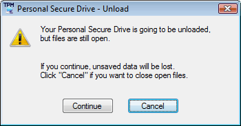 Когда доступ к секретным данным больше не нужен, мы опять кликаем по иконке утилиты Infineon в трее и отключаем свой тайный диск. Если при этом диск используется, нам выдадут соответствующее предупреждение, что несохранённые данные могут быть потеряны.