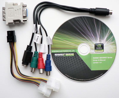Видеокарта от тайваньской компании Sysconn была предоставлена нам на тестирование в OEM варианте в обычной белой коробке. Внутри помимо видеокарты находились один переходник 15 pin DVI / D-Sub, разветвитель с S-Video выхода, компакт-диск с драйверами и переходник для подключения дополнительного питания видеокарты: