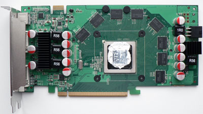 Рядом с ней соседствуют два порта DVI-I (dual-link) с поддержкой высоких разрешений и видеовыход. Без системы охлаждения видеокарта выглядит следующим образом: