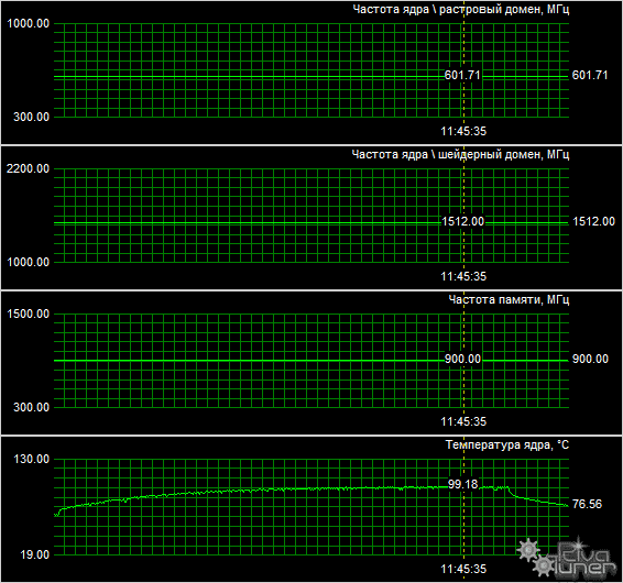 Засомневавшись в корректности этих показаний, я проверил состояние видеокарты тактильно, и оказалось, что текстолит платы чуть теплый, а оборотную сторону видеокарты напротив графического процессора едва можно назвать горячей. Учитывая, что при этих "124" градусах Цельсия видеокарта функционировала как ни в чем ни бывало, скорее всего проблема кроется в некорректно работающем датчике мониторинга. Ещё большую смуту в эти показатели внёс Arctic Cooling Accelero S1 в комплекте с турбо-модулем, установленный на видеокарту, так как температура GPU достигла 99 градусов Цельсия: