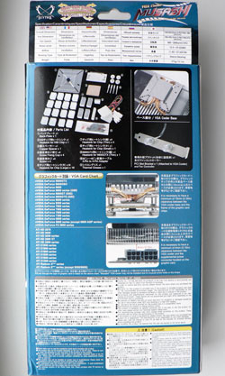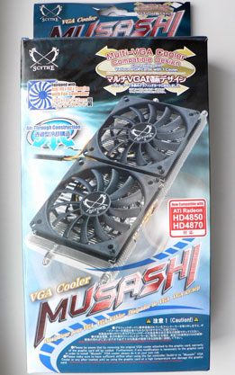 На лицевой стороне приведено крупное фото кулера и наклейка, информирующая потенциального покупателя о совместимости Scythe Musashi с видеокартами ATi Radeon HD 4870 и HD 4850, которая, по всей видимости, появилась уже после выхода кулера. На оборотной стороне можно обнаружить фото с аксессуарами комплекта поставки, перечень совместимых видеокарт, подробные технические характеристики на нескольких языках и даже два фото установленного на видеокарту кулера. Выпускается Scythe Musashi на Тайване.