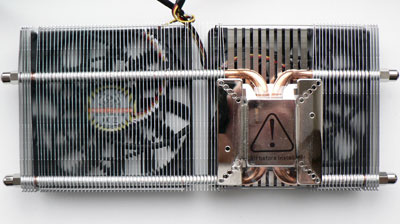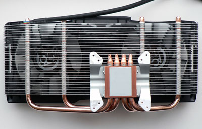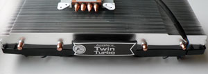 Так как тепловые трубки, выходя из основания, проходят вдоль видеокарты, а не поперёк, как это чаще всего бывает в воздушных системах охлаждения для видеокарт, то по-иному сконструировать эту часть Scythe Musashi вряд ли было возможно. Вообще, странно, почему в Scythe Musashi используются только две тепловые трубки, а не четыре, как это могло бы быть? Ведь в этом случае эффективность нового кулера могла бы быть и выше.