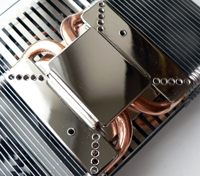 Несмотря на кажущуюся громоздкость конструкции, толщина кулера составляет 35 мм. В медном основании трубки лежат в желобках, а места сопряжений трубок и основания пропаяны.