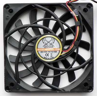 Два вентилятора типоразмера 80 х 80 х 10 мм закреплены в пластиковой рамке, зацепляющейся за рёбра: