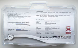 Accelero Twin Turbo представляет собой систему охлаждения для видеокарт размерами 212.0 x 103.0 x 34.0 мм и весом в 350 грамм, вся лицевая сторона которой закрыта пластиковым кожухом с установленными на нём вентиляторами: