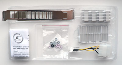 В их числе две решётчатых планки на заднюю стенку корпуса системного блока, инструкция по установке, комплект винтов и шайб, четыре алюминиевых радиатора на силовые элементы платы, восемь радиаторов на микросхемы видеопамяти и переходник для подключения питания вентиляторов к мolex-разъёму блока питания.
