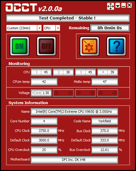 Кроме того, так как Linpack слишком сильно прогревает процессор, дополнительное тестирование проводилось с помощью 23-минутного CPU-теста OCCT v2.0.0a (c максимальным приоритетом):
