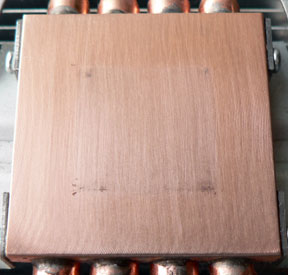 Ровность основания кулера очень близка к идеальной. Ну а теплораспределитель центрального процессора уже задолго до сегодняшних тестов был мною выведен до также близкой к идеально ровной поверхности и обработан наждачной бумагой (1000). То есть обе контактирующие поверхности выполнены из меди и обработаны весьма качественно. Полировке ни одна из поверхностей не подвергалась. Кулер устанавливался всегда в одном положении, и прижимался винтами равномерно с постепенным притягиванием по диагонали.