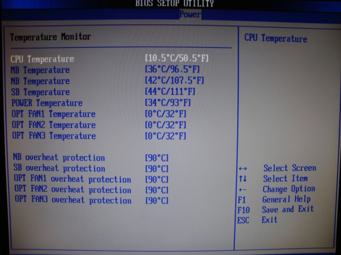 Далее идет пункт Temperature Monitor – отображение информации о нагреве процессора, северного моста, южного моста, системы питания платы, температуры самой платы и температуры на трех термопарах, также плата позволяет задать критические значения температур северного и южного моста и всех трех термопар: