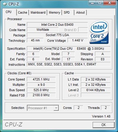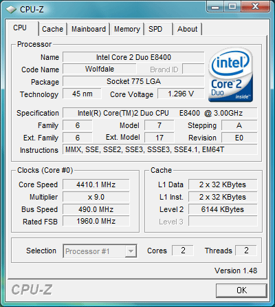 - Intel Core2 Duo E8400 3.0GHz, 333MHz FSB, 6MB L2, Wolfdale rev. E0