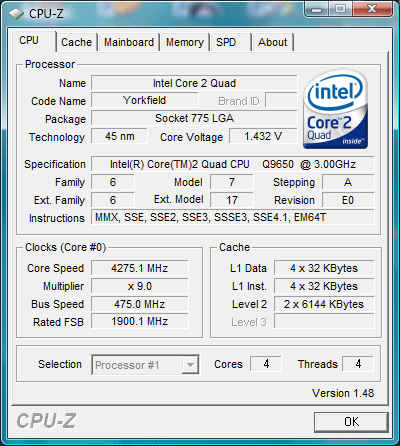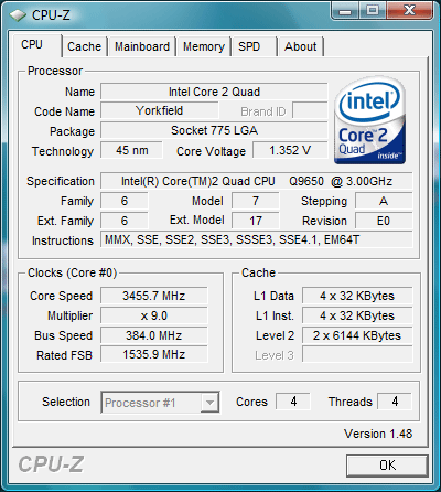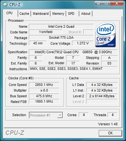 - Intel Core2 Quad Q9650 3.0GHz, 333MHz FSB, 2x 6MB L2, Yorkfield rev. E0