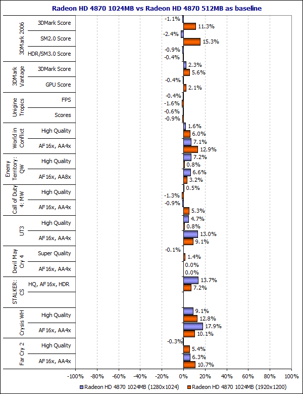В первую очередь, по совокупности всех бенчмарков и протестированных сегодня игр была построена сводная диаграмма сравнения производительности Radeon HD 4870 с объемом памяти в 1024 Мбайт с референсной Radeon HD 4870 512 Мбайт на одинаковых частотах в 750/3600 МГц. Последняя видеокарта принята на диаграмме за основу, и именно от неё показан прирост/снижение производительности: