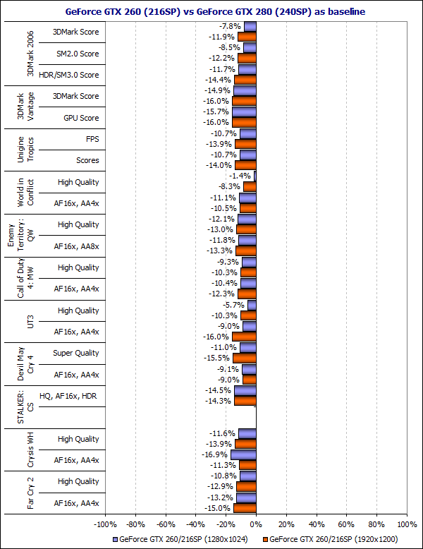 Наконец, третья диаграмма позволит посмотреть на отставание GeForce GTX 260/216SP от топовой видеокарты GeForce GTX 280: