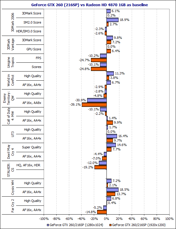 В завершении я предлагаю вам сравнить между собой производительность видеокарт GeForce GTX 260/216SP 896 Мбайт на номинальных частотах в 575/1242/1998 МГц и Radeon HD 4870 1024 Мбайт с частотами в 750/3600 МГц. На диаграмме результаты тестирования видеокарты на графическом процессоре RV770 приняты за 100 %, а результаты на G200 представлены в виде отклонений: