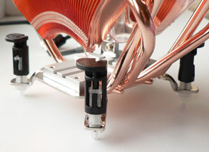 А вот на LGA 775 кулер устанавливается с помощью пластиковых защёлок. Усилие прижима в этом случае довольно высокое, так как данный тип крепления даже материнскую плату выгибает. Однако, я бы предпочёл увидеть для кулера такой массы в комплекте сквозное винтовое крепление с backplate. Ну и напомню ещё раз, что пока крепления для платформ под новые процессоре Core i7 (LGA 1366) в комплекте поставки кулера отсутствуют.