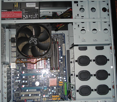 Факт конечно очень грустный, но кулер пришлось сменить на обычный Big Typhoon, который также встал на материнскую плату не без проблем. Корпусам от Antec критически не хватает высоты – еще три-четыре сантиметра, и выбор кулеров для этих корпусов был бы гораздо более широким. Практически "впритык" встала и видеокарта, обладателям видеокарт размерности nVidia GTX280 или ATI Radeon 4870х2 об этих корпусах можно забыть сразу же. Путем нехитрых измерений было установлено, что максимальное расстояние от задней стенки корпуса до жестких дисков составляет не более 25-26 см.