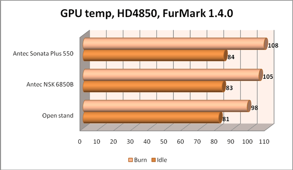 Итак – что мы видим? Как ни прискорбно – данные корпуса совершенно не подходят для использования в составе такой мощной и горячей системы. Температуры видеокарты в тесном закрытом пространстве Sonata Plus просто зашкаливают, кроме того в процессе проведения тестирования видеосистемы внешняя стенка корпуса стала весьма теплой на ощупь, о "климате" внутри системного блока в этой ситуации можно только догадываться. NSK 6850 показал несколько лучший результат, – скорее всего помогло наличие воздуховода и сквозной перфорации на боковой стенке.