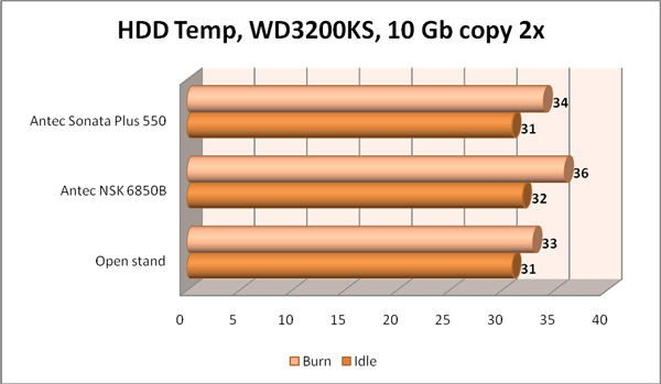 В сравнении с остальными компонентами системы, жесткий диск нагрелся гораздо меньше. Особенно хорошо показал себя в этом плане корпус Sonata Plus с фирменной системой крепления. Между стенками жесткого диска и корзины остались небольшие зазоры, что обеспечило лучший температурный режим.